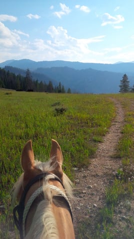 We lost the trail in mid afternoon in tall bunch grass. It was very steep and we had to walk the horses a lot...too steep to ride. We finally found the trail in the lower part of a drainage or