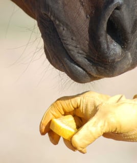 spritzing a little juice from a small piece of lemon in the direction of his nose. Your horse should come into your space only when invited with the “cookie time” cue.
