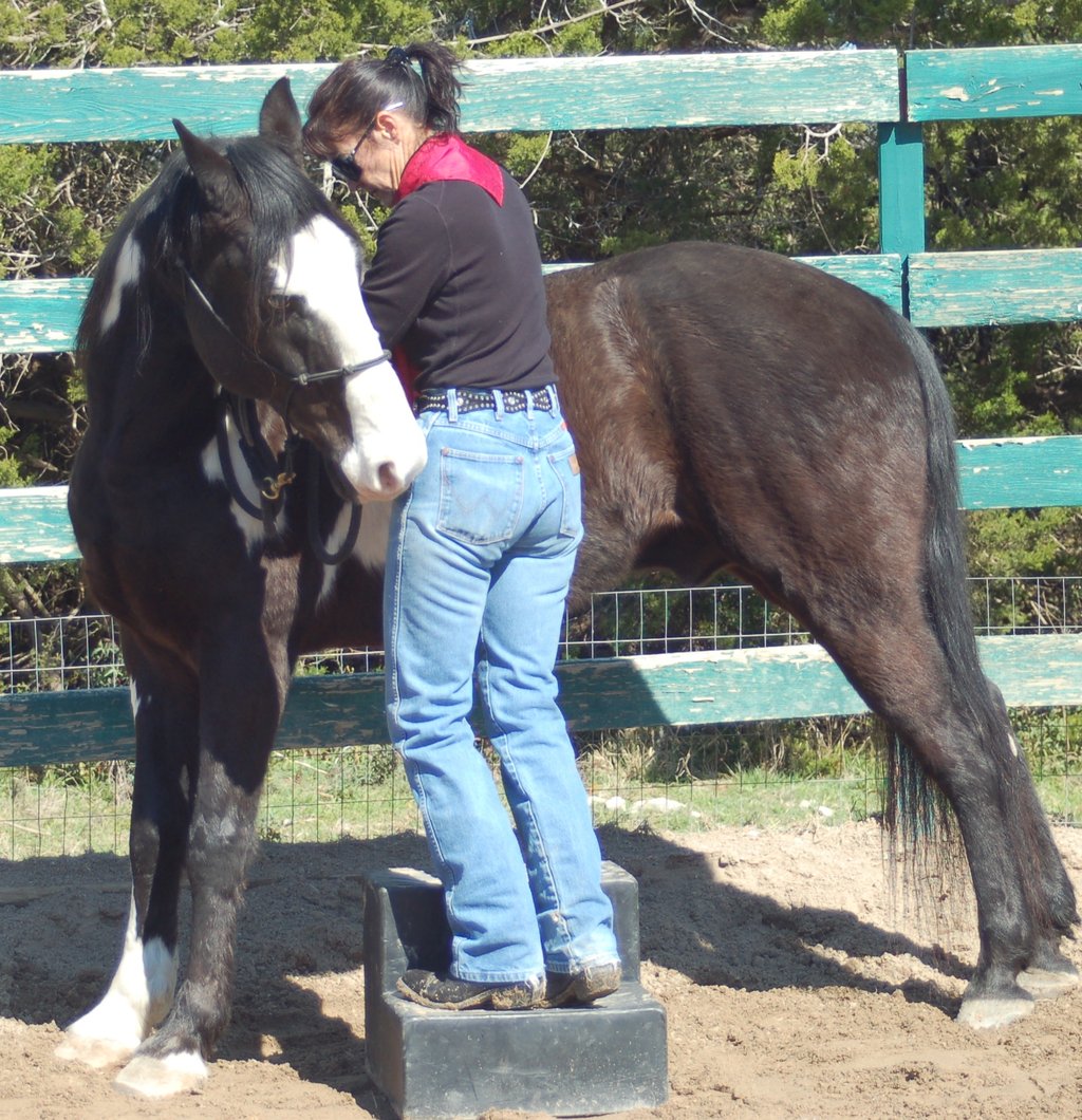 In Trick Training we create Behavior Chains which means linking moves together. One of the goals of a variable reward system is to be able to reward the horse at the end of several moves. An example would be for a horse to Step Up (on the pedestal, Salute with left leg, Salute with right leg, pivot the hind end around the front that is still anchored on the pedestal and then reward the horse. This happens over a period of time, to be determined by the individual progress of the horse.